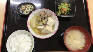 ⚫︎肉豆腐 ⚫︎小松菜と人参のナムル ⚫︎ちくわの磯辺和え ⚫︎お味噌汁