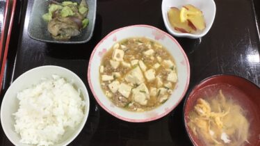 ⚫︎麻婆豆腐 ⚫︎きゅうりと茄子の和え物 ⚫︎さつまいものレモン煮 ⚫︎卵スープ