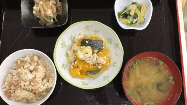 本日のお食事 9/24(水)のお昼ごはん🎃カボチャのそぼろ煮😋 ⚫︎カボチャのそぼろ煮 ⚫︎豆腐ときのこの餡掛け ⚫︎キャベツと小松菜の煮浸し ⚫︎混ぜご飯 ⚫︎みそ汁 2025.09.24 本日のお食事