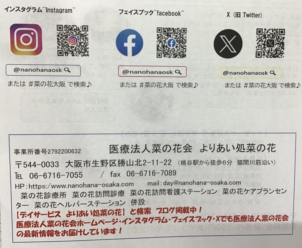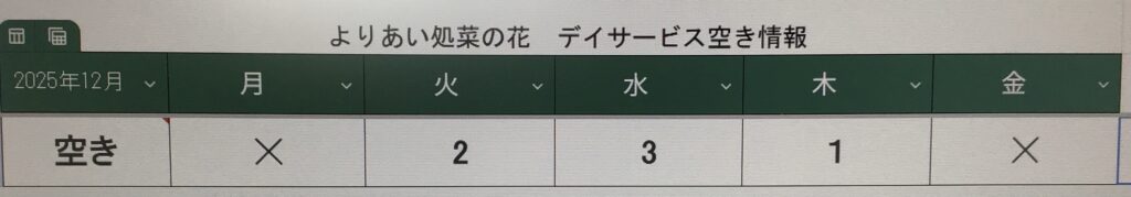デイサービス12月空き情報 お知らせ 2025.12.08 ただいま体験利用者の募集をしております。 お気軽にお問い合わせ下さい♫ 体験料金700円(昼食、おやつ、飲み物代) 入浴無料 お問い合わせは下記までお願いいたします。 よりあい処菜の花 電話06-6716-7055