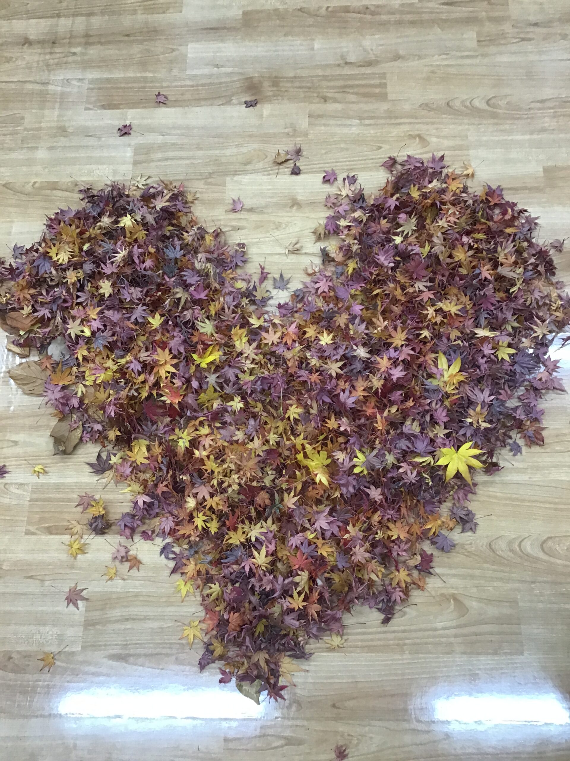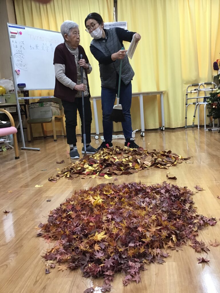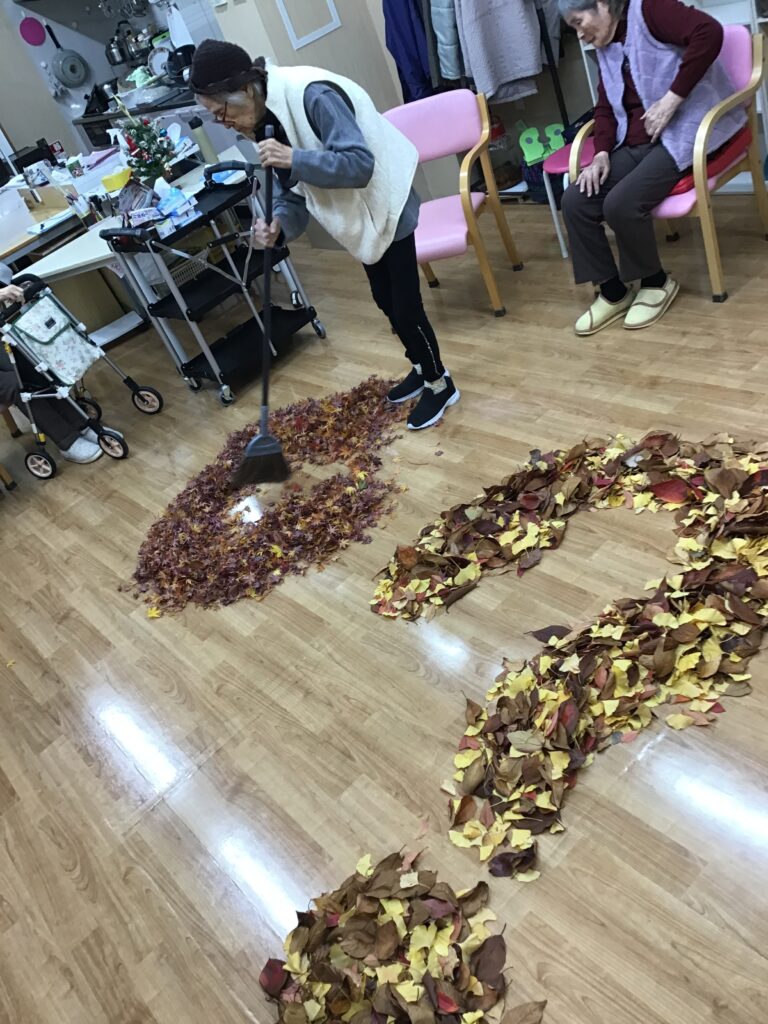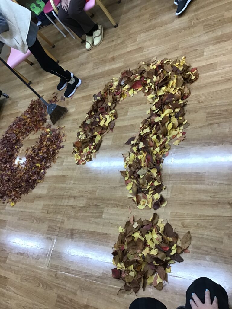 本日のレクリエーションは、奈良、四天王寺、御堂筋の落ち葉を集めて床一面で落ち葉アートに挑戦💪