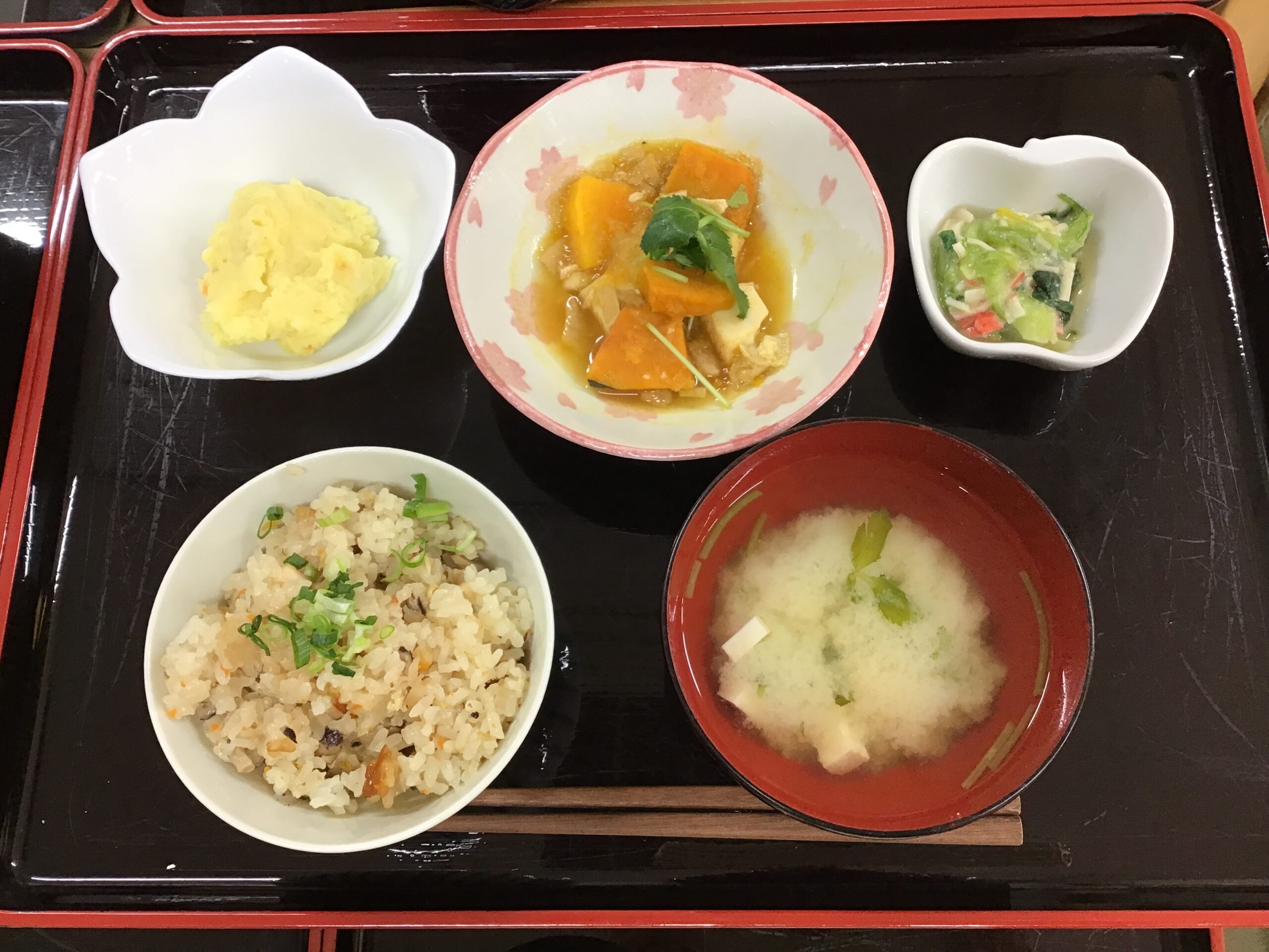 2/12(木)のお昼ごはん🥕🍄🟫炊き込みご飯🐓😋 本日のお食事 2026.02.12 ⚫︎炊き込みご飯 ⚫︎かぼちゃと厚揚げのみぞれ煮 ⚫︎青梗菜とカニカマの柚子味噌和え ⚫︎じゃがいもとさつまいものサラダ ⚫︎お味噌汁