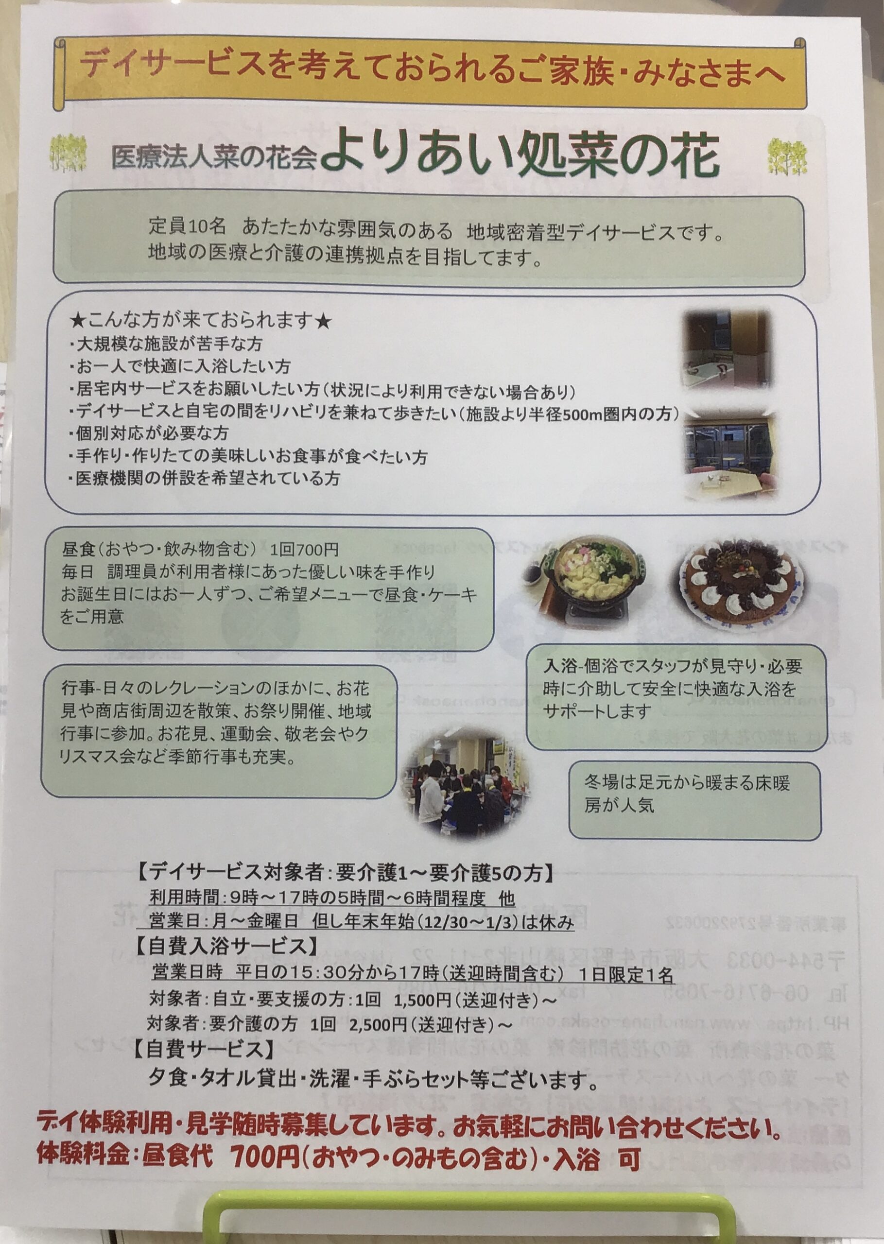 デイサービス体験利用無料‼️キャンペーン中😁 お知らせ 2026.02.12 ただいま体験利用者様の募集をしております🎶 お気軽にお問い合わせください❗️ ↓下記が2月現在の空き情報です 体験利用料金700円(昼食、おやつ、飲み物代) ↑今だけ無料‼️です😳 入浴無料 お問い合わせは下記までお願いいたします。 よりあい処菜の花 電話06−6716-7055