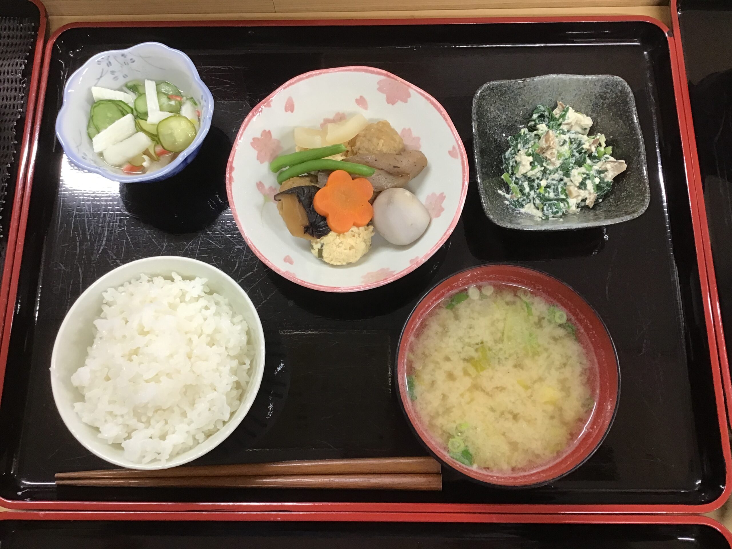 4/22(水)のお昼ごはん🥕肉団子と野菜の炊き合わせ🐓 本日のお食事 2026.04.22 ⚫︎肉団子と野菜の炊き合わせ ⚫︎きゅうりと長芋カニカマの酢の物 ⚫︎ほうれん草の白和え ⚫︎お味噌汁 ⚫︎米飯