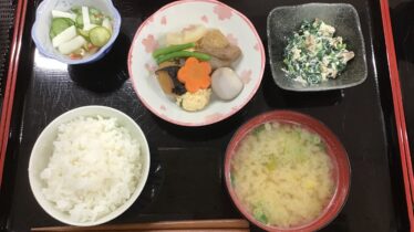 本日のお食事 4/22(水)のお昼ごはん🥕肉団子と野菜の炊き合わせ🐓 ⚫︎肉団子と野菜の炊き合わせ ⚫︎きゅうりと長芋カニカマの酢の物 ⚫︎ほうれん草の白和え ⚫︎お味噌汁 ⚫︎米飯 2026.04.22 本日のお食事
